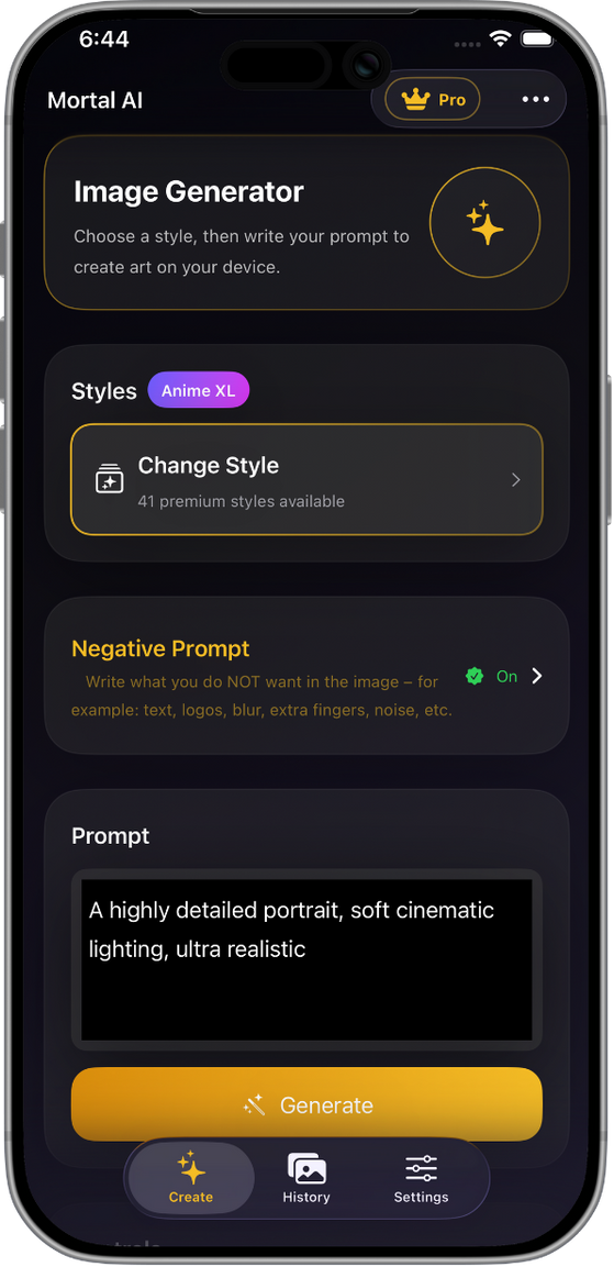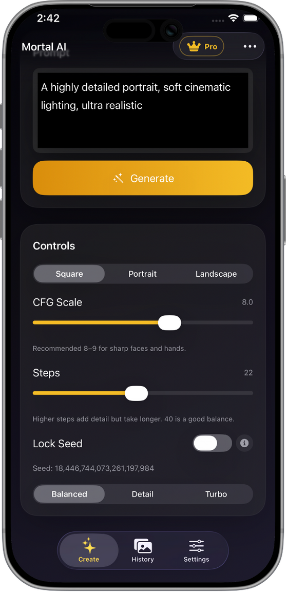 Stop paying for tokens. Mortal AI uses your device's Neural Engine to render HD art without a single byte of data leaving your phone. It's your studio, your rules.